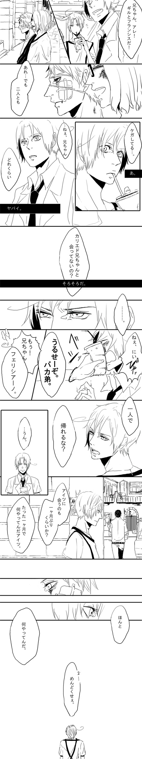 カリエドは普段ヘラヘラしてる分、怖い。し、自分でも止められないから一暴れした後、目の前の光景を見て泣いて謝ったり、 嫌いにならんといて ってすがったり、無表情で消えて次に会うときは平然としてたり、数日一切会おうとしなかったり。