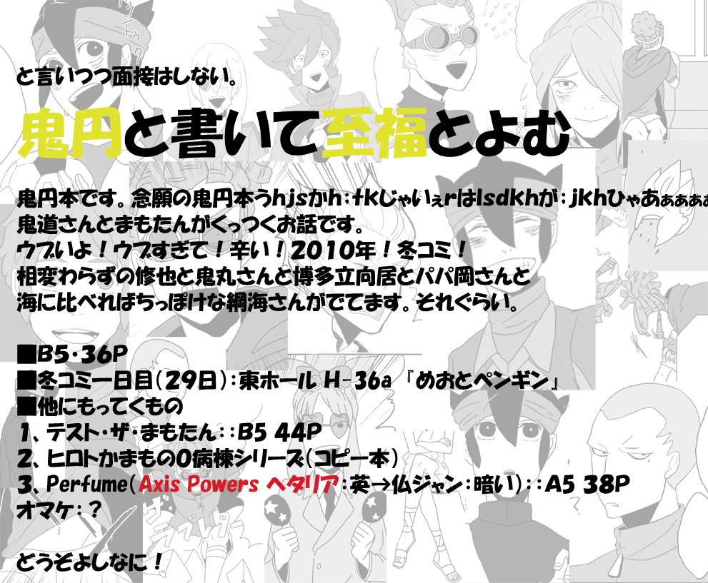 まだ白紙真っ盛りです間に合うのかこれ~何とか鬼円本と0病棟まも編とヒロト編だしたいですうぐぅ。